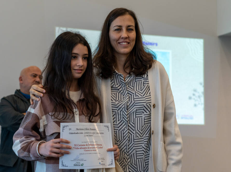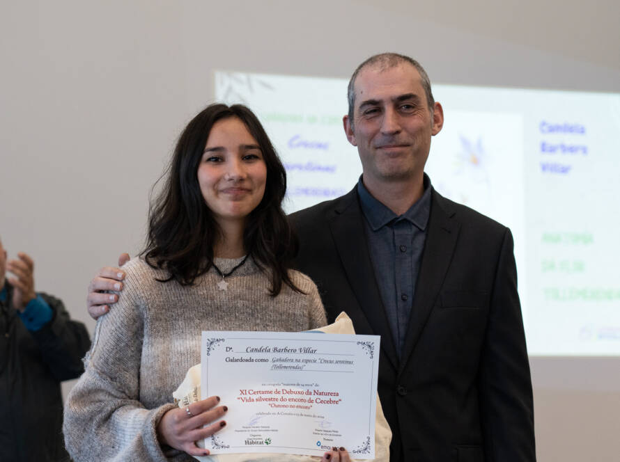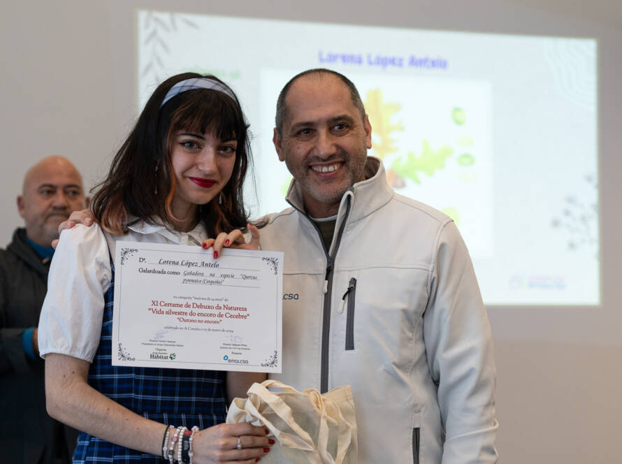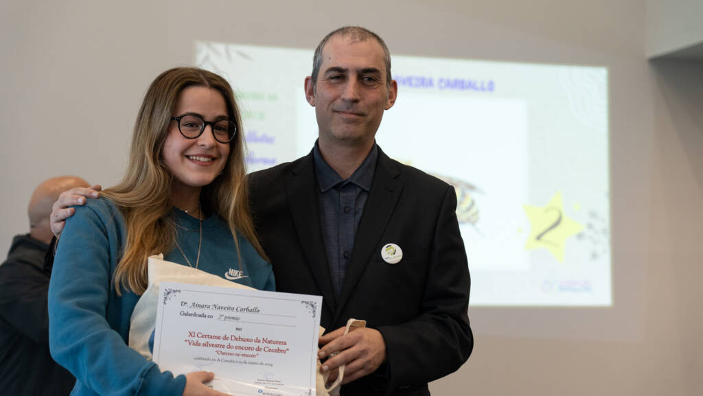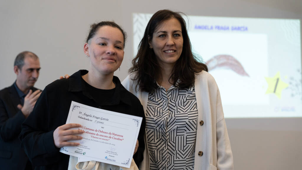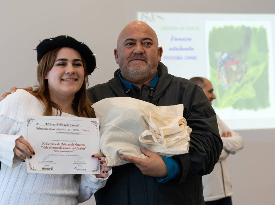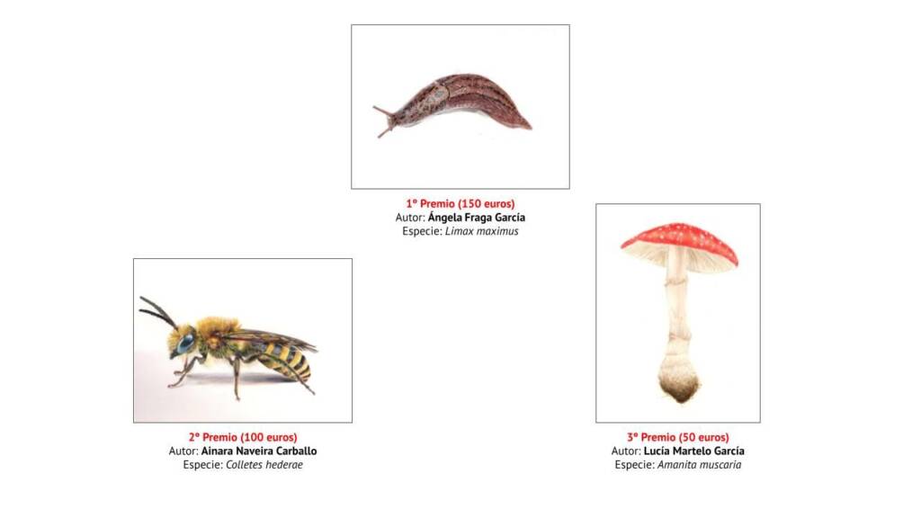 Fue numeroso el público que se acercó a la Casa del Agua para asistir a la entrega de premios. En la categoría de mayores de 14 anos resultó ganadora Ángela Fraga García con una ilustración del Limax maximus (Babosa leopardo). Ángela recibió el diploma que la acredita como ganadora en esta categoría de manos de Noemí Díaz Vázquez, concejala de Medio Ambiente del Ayuntamiento de A Coruña. El segundo puesto fue para Ainara Naveira Carballo con un dibujo de la Colletes hederae (Abeja de la Hiedra). Ricardo Ferreiro, presidente del Grupo Naturalista Hábitat, le entregó su diploma. Por último, Lucía Martelo García, con una ilustración de la Amanita muscaria (Matamoscas), fue tercera y recibió su galardón de manos de Ricardo Vázquez, director de I+D+i de Emalcsa. Además de sus diplomas, los tres primeros clasificados recibieron 150, 100 e 50 euros, respectivamente, y diferentes regalos. En la entrega de galardones también estuvo presente José Antonio Santiso, presidente de la Reserva da Biosfera Mariñas Coruñesas e Terras do Mandeo.