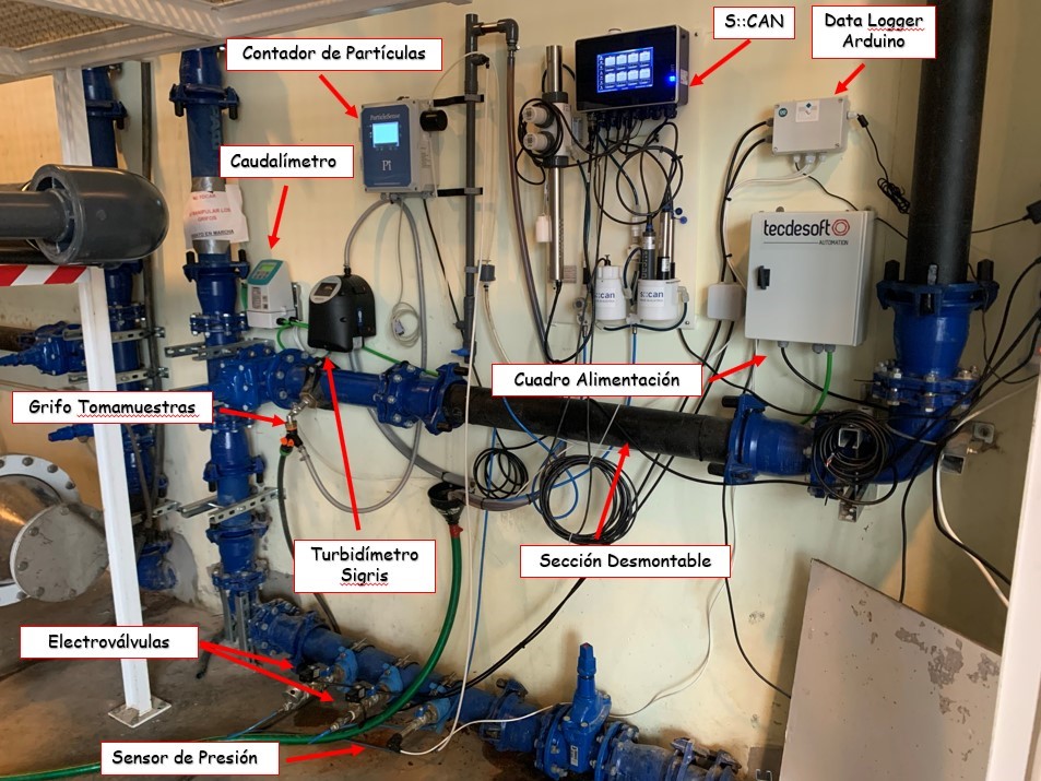 • Sistema compacto S::CAN para una caracterización físico-química en continuo midiendo parámetros de calidad como pH, temperatura, conductividad, color, turbidez, cloro residual….Además el sistema se utiliza de forma recurrente como banco de pruebas de nuevas tecnologías de monitorización en tiempo real, al disponer de un volumen significativo y validado de datos que permiten probar y validar nuevas tecnologías que después pueden ser implementadas en la red de control de producción del sistema de abastecimiento para la correcta explotación de este.