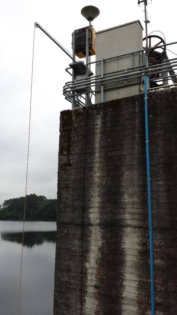 • Un perfilador YSI equipado con una sonda multiparamétrica YSI EXO2. El perfilador es un sistema electromecánico que permite la inserción programada de la sonda multiparamétrica en la masa de agua con el fin de evaluar sus cambios de calidad a lo largo de una sección vertical en el mismo periodo de tiempo. Este perfilador está instalado aguas arriba de la presa de Cecebre si bien, por comparación con las instaladas en Cañás y A Telva, la sonda incorpora un sensor adicional para medir el potencial de oxidación/reducción. El perfilador tiene como función principal realizar un seguimiento de la calidad del agua del embalse a lo largo del tiempo y en su vertical, de modo que es una herramienta clave para entender la dinámica limnológica de este sistema.