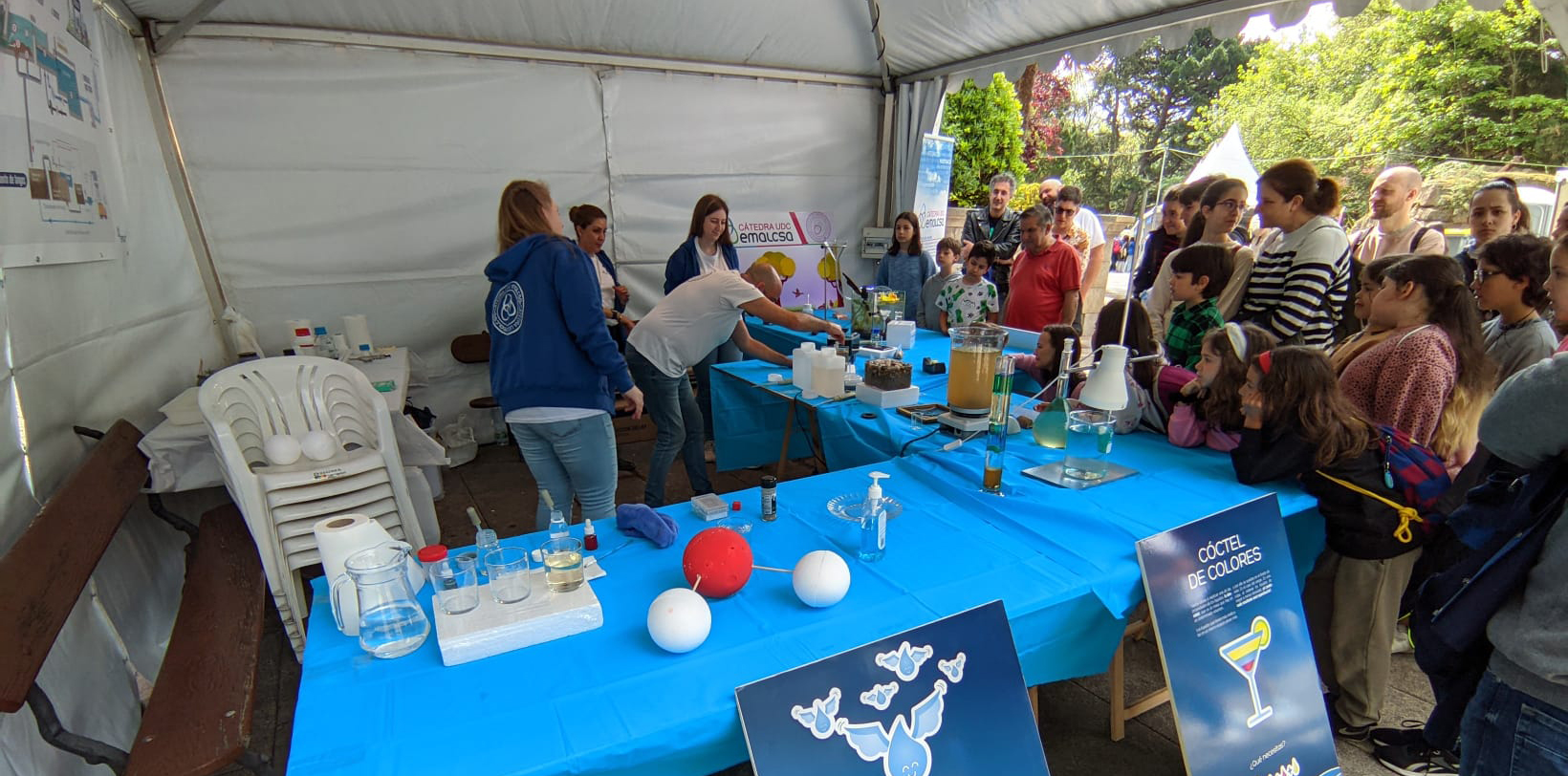 La Cátedra Emalcsa-UDC tuvo de nuevo jaima propia. En ella mostró curiosos experimentos relacionados con el agua entre los cuales introdujo uno novedoso con respecto a anteriores ediciones de la feria: una simulación de algunas de las fases que se realizan para potabilizar el agua y que ésta llegue a nuestros grifos en óptima calidad. Una especie de imitación, a pequeñísima escala, del proceso de potabilización del agua que se desarrolla en la ETAP de A Telva situada en Cambre, estación que se ocupa de tratar el agua que consumimos en A Coruña y su área metropolitana.