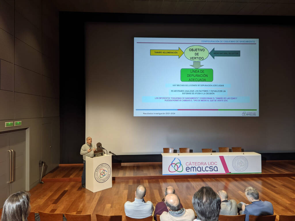 Finalmente, Joaquín Suárez, doctor ingeniero de Caminos, Canales y Puertos, profesor de la UDC, miembro del Grupo Geama y primer director de la Cátedra Emalcsa-UDC, presentó un proyecto centrado en el análisis de soluciones de saneamiento en el medio rural con población dispersa, con una aplicación práctica en el concello de Carral. El estudio realizado validó el sistema utilizado, aunque también reveló la necesidad de revisar algunos parámetros, y que su origen está vinculado a los trabajos previos desarrollados entre el grupo GEAMA y Augas de Galicia para definir los sistemas de saneamiento en áreas rurales.