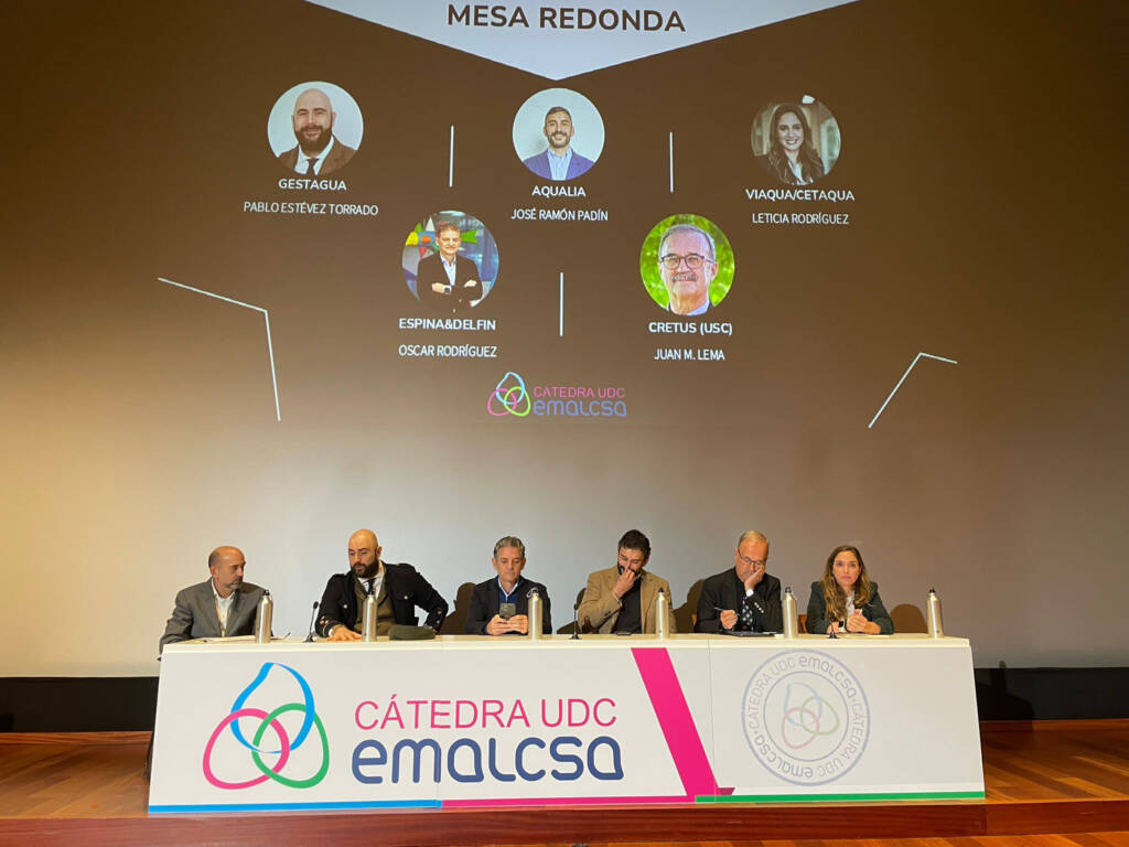 A continuación se celebró una mesa de debate que moderó el vicerrector de Investigación y Transferencia de la Universidade da Coruña, Jerónimo Puertas. En ella, Pablo Estévez Torrado (Gestagua), José Ramón Padín (Aqualia), Leticia Rodríguez (Viaqua/Cetaqua), Óscar Rodríguez (Espina&Delfín), y Juan M. Lema, del Centro de Investigación Interdisciplinar en Tecnologías Ambientales (Cretus) de la Universidad de Santiago, debatieron sobre el estado y el futuro de la I+D+i en el ámbito de la gestión del agua urbana en Galicia. En el debate se manifestó de forma generalizada la importancia de la I+D+i para dar respuesta a los retos planteados y que existe capacidad en el tejido gallego, pero que hay dificultades muy importantes en términos de financiación. También se manifestó la necesidad de la colaboración y el establecimiento de sinergias para alcanzar mejores logros y poder mejorar de forma significativa la problemática en entornos de gestión de pequeñas comunidades.
