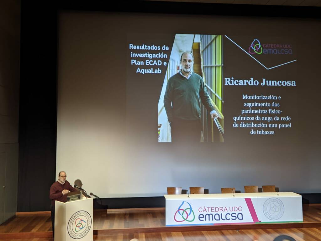 Tras una pausa-café de media hora se retomó la jornada con la presentación de los resultados de las investigaciones desarrolladas en el marco del Plan ECAD y el AquaLab. Ricardo Juncosa, catedrático de la Universidade da Coruña en el departamento de Ingeniería Civil, fue el primero en intervenir para exponer los trabajos de monitorización y seguimiento de los parámetros fisicoquímicos del agua de la red de distribución en un panel de tuberías para analizar la calidad del agua. Según Juncosa, los estudios realizados señalan la necesidad de identificar y caracterizar los procesos químicos que influyen en la generación de episodios de turbidez en el agua de A Coruña, la necesidad de disponer de puntos de control y seguimiento en la red de abastecimiento y en la salida de las estaciones de tratamiento de agua potable, y la importancia de identificar en la red puntos vulnerables en los que se puedan formar sedimentos.
