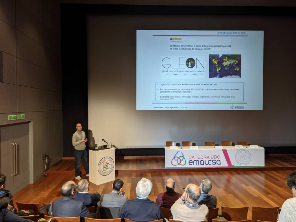 José Luis Cereijo, investigador del Grupo de Investigación Ingeniería del Agua y del Medio Ambiente (Geama) de la UDC fue el encargado de iniciar la presentación de resultados de las investigaciones realizadas en el marco del Plan AdO en el área de Limnología. Cereijo hizo una exposición sobre los sistemas utilizados para el control de la calidad de las aguas. En este sentido se refirió a la participación del embalse de Cecebre en la Red Gleon, una red científica internacional con observatorios de lagos y embalses en todo el mundo. Cecebre es el único de la Península Ibérica. Los investigadores de la Cátedra han participado en diferentes iniciativas enmarcadas en esta red a las que se refirió Cereijo. Algunas de ellas dieron lugar a relevantes estudios, como el que fue portada de la revista Nature sobre la presencia de microplásticos en lagos y embalses.