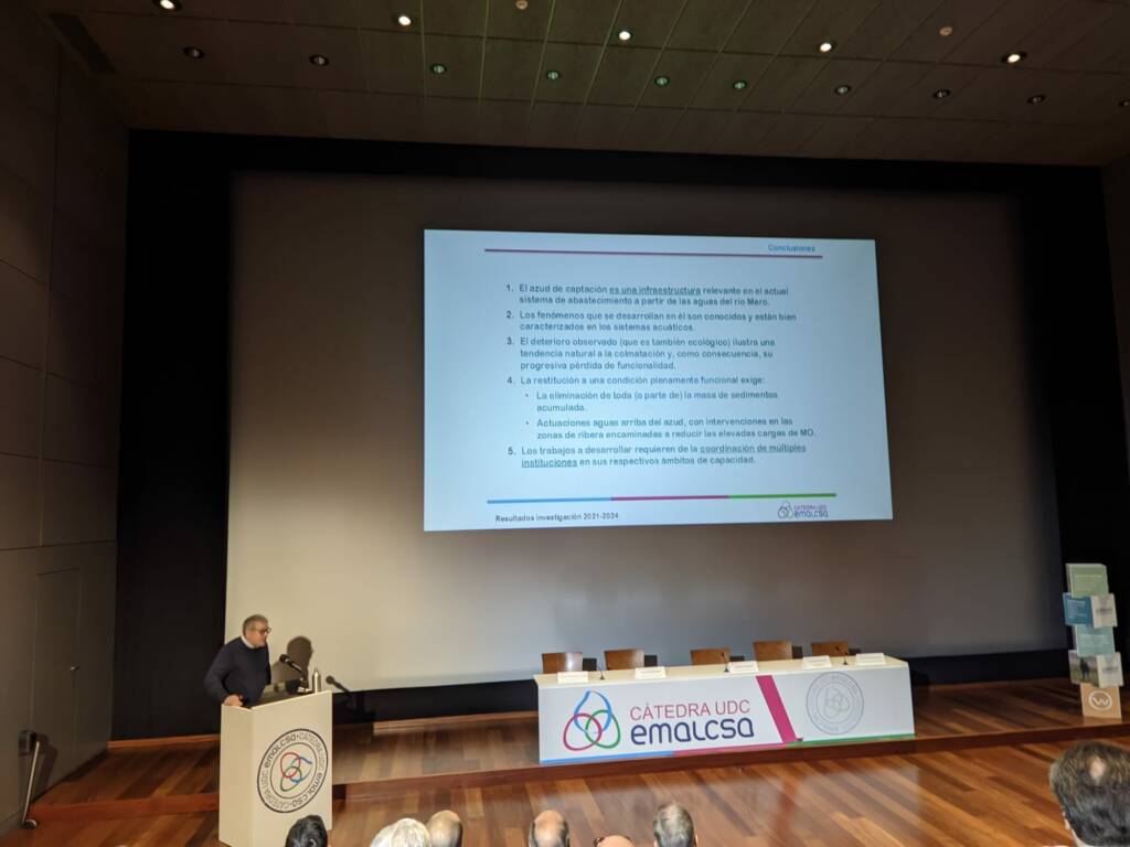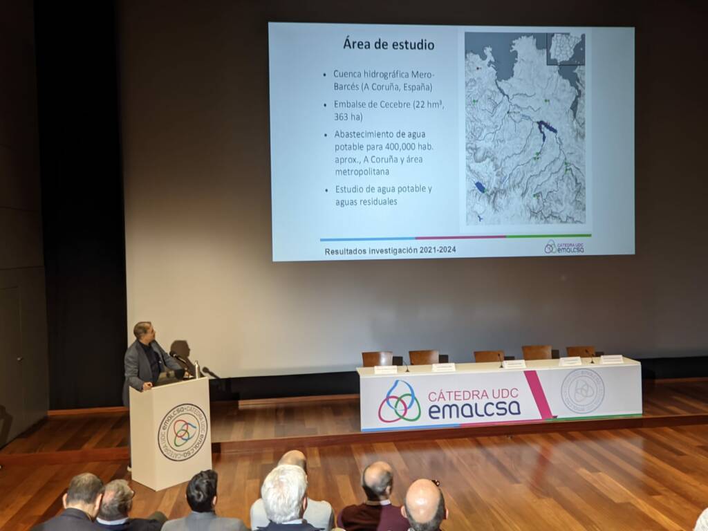 Moisés Canle, catedrático de Química Física de la UDC y director de la Cátedra Emalcsa-UDC desde 2021 hasta enero de 2024, cerró la presentación de resultados del Plan AdO (área Limnología). Canle explicó los trabajos realizados para monitorizar la presencia de contaminantes emergentes y microplásticos en la cuenca de los ríos Mero y Barcés y en el abastecimiento de agua a A Coruña. Por lo que respecta a los primeros, el ex director de la Cátedra Emalcsa-UDC señaló que, aunque los resultados no son preocupantes, es conveniente seguir monitorizando y plantearse tratarlos, si bien la tecnología existente para hacerlo aún no es completamente operativa. En cuanto a los microplásticos su presencia no es relevante y no merma la calidad del agua. No obstante sí apuntó la conveniencia de establecer mecanismos de control y prevención.