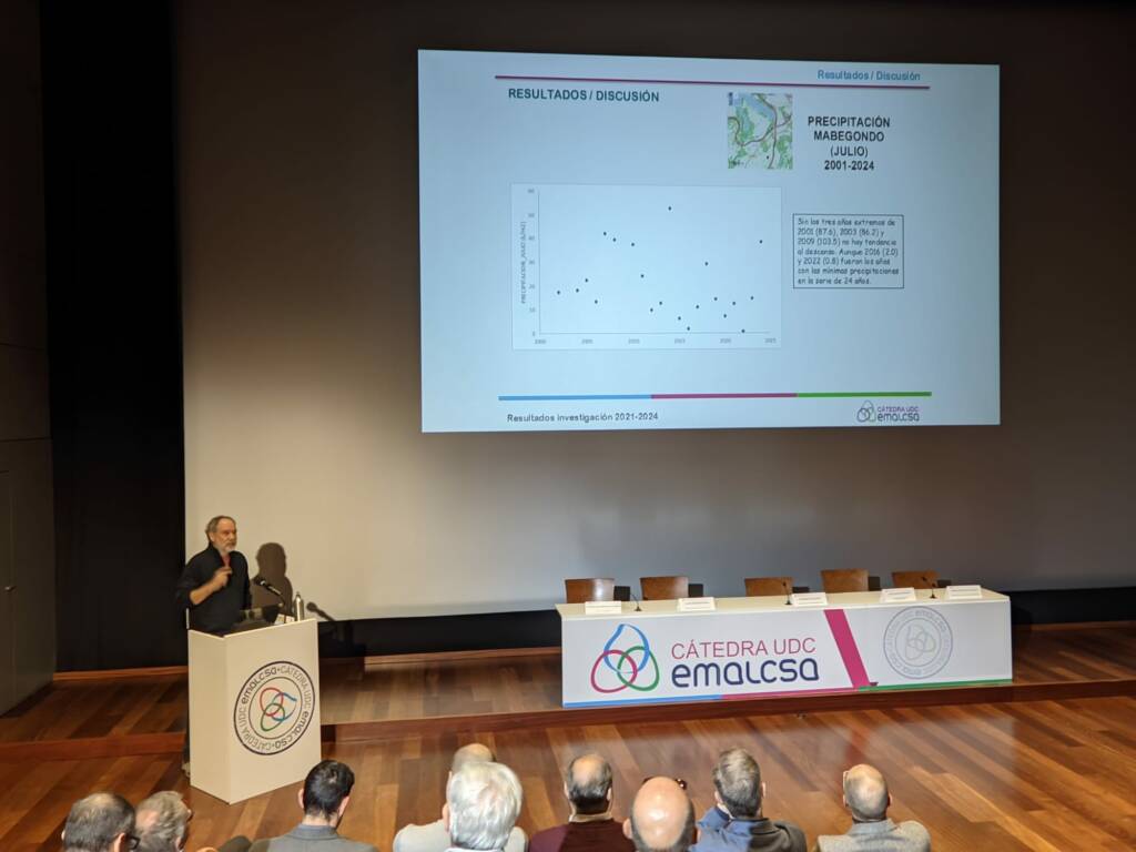 Tras la presentación de la jornada intervino Ricardo Vázquez, director de I+D+i de Emalcsa, para hacer un pequeño recorrido por la historia de la Cátedra y por los proyectos realizados por ella en los últimos tiempos. Vázquez no sólo se refirió a las iniciativas de investigación, también quiso destacar las relativas a la divulgación ambiental que lidera el programa Coawa, la comunidad del agua, una iniciativa que acerca a la sociedad la importancia del agua desde una visión integrada con el medio ambiente y las personas. El director de I+D+i de Emalcsa explicó que en los últimos 8 años se desarrollaron 25 proyectos en el ámbito de la Cátedra en los que participaron más de 50 investigadores de la UDC y que la aportación económica de Emalcsa a las actividades de la Cátedra rondó los 700.000 euros. Para rematar su ponencia, anunció la intención de la Cátedra de crear un espacio de debate en el que podrían participar investigadores gallegos del sector del agua.