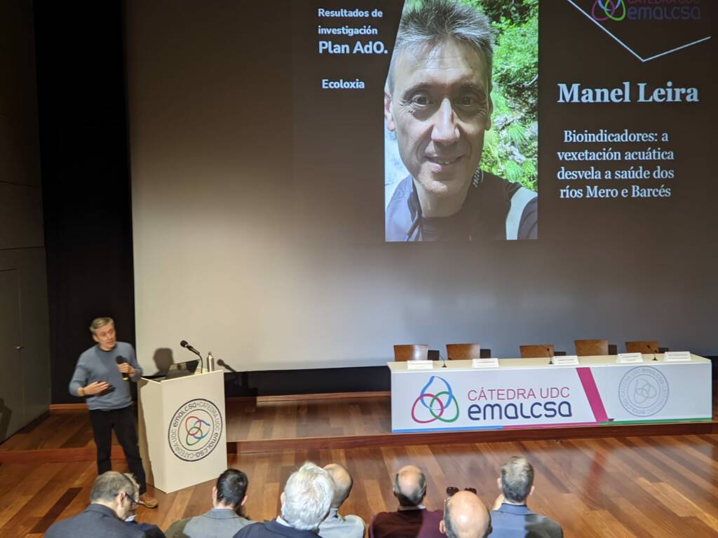 Manel Leira, actualmente investigador en el grupo de Biodiversidad, Biogeografía y Conservación Integrativa de la Universidad de Santiago de Compostela; y Alejandro Martínez Abraín, profesor titular de Ecología en la UDC, fueron los encargados de presentar los resultados del Plan AdO en el área de Ecología. La ponencia del primero fue Bioindicadores: la vegetación acuática desvela la salud ecológica de los ríos Mero y Barcés. En ella reveló que los estudios realizados señalan que el estado ecológico del río Barcés es excelente y que el del Mero, aunque inferior, está entre moderado y bueno. Leira señaló que el peor estado del Mero se debe, seguramente, a la intervención humana, que es más intensa que en el caso del Barcés.