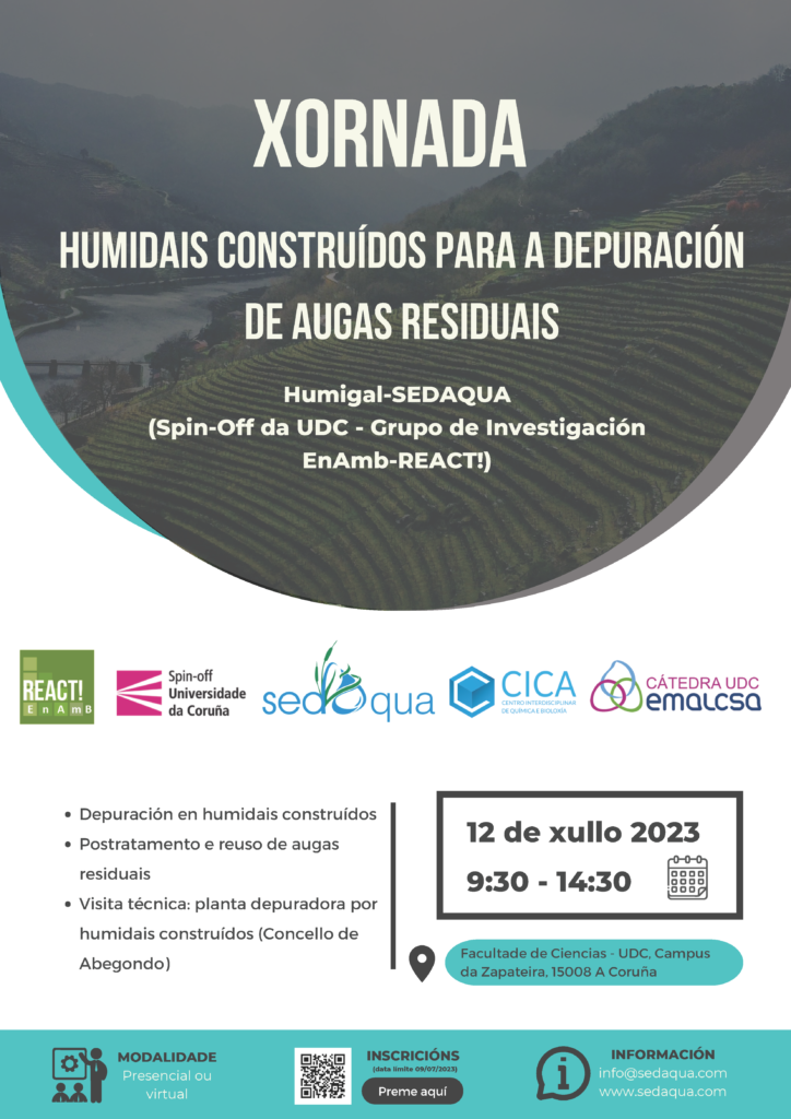 El próximo 12 de julio, en el Salón de Actos de la Facultad de Ciencias de la Universidad de A Coruña, tendrá lugar la jornada ‘Humedales construidos para la depuración de aguas residuales’. La Cátedra Emalcsa-UDC promueve este evento organizado por la spin-off de la universidad herculina, Humidal Sedaqua, y el grupo de investigación de la UDC, EnAmb-React!.