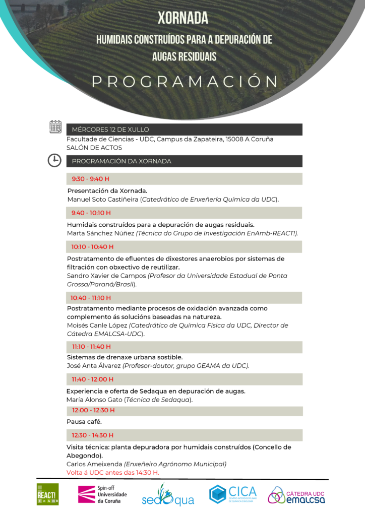 La jornada comenzará a las 9.30 h. y finalizará a las 14.30 h. y en ella participarán distintos expertos en la materia. Marta Sánchez Núñez (investigadora del grupo EnAmb-React!), explicará el funcionamiento de los humedales construidos para la depuración de aguas residuales. Sandro Xavier de Campos (profesor de la Universidad Estadual de Ponta Grossa, Paraná, Brasil) abordará el postratamiento de efluentes digestores anaerobios por sistemas de filtración con objetivo de reutilizar aguas residuales. Moisés Canle, director de la Cátedra Emalcsa-UDC, será también uno de los ponentes de esta jornada, en la que abordará el postratamiento mediante procesos de oxidación avanzada como complemento a las soluciones basadas en la naturaleza. José Anta (profesor de la UDC e investigador del grupo Geama) hablará de los sistemas de drenaje urbano sostenible. Finalmente, María Alonso Gato (técnica de la empresa organizadora del evento, Sedaqua) explicará la oferta que presenta su firma en lo que respecta a depuración de aguas.
