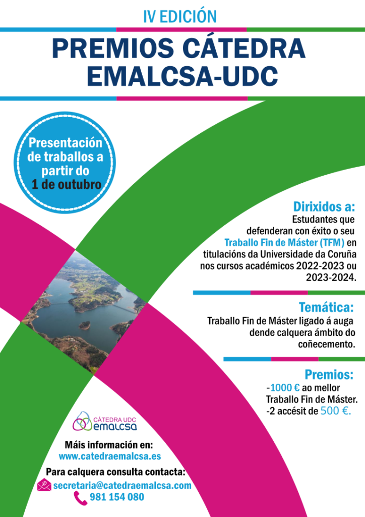 La Cátedra Emalcsa-UDC abrirá el 1 de octubre la convocatoria de la cuarta edición de sus premios, unos galardones dirigidos a estudiantes que hayan defendido con éxito su Trabajo Fin de Máster (TFM), relacionado con el agua, en titulaciones de la Universidade de A Coruña en los cursos académicos 2022/2023 o 2023/2024.