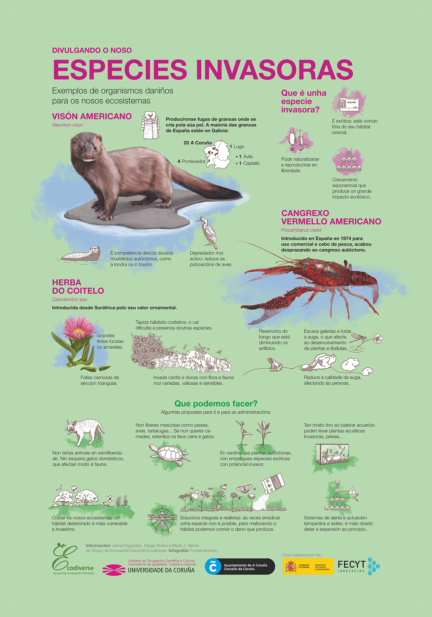 La campaña se centra en la difusión de las cinco infografías seleccionadas en el programa Divulgando o noso da la universidad herculina, concurso creado con el objetivo de difundir el trabajo de los investigadores de la UDC. Una de ellas se centra en las especies invasoras y está elaborada por María José Servia, Jaime Fagúndez y Sergio Roilca, pertrenecientes al Grupo de Innovación Docente Ecodiverse. Los dos primeros son colaboradores de la Cátedra Emalcsa-UDC y María José Servia forma parte de su comité científico-técnico.